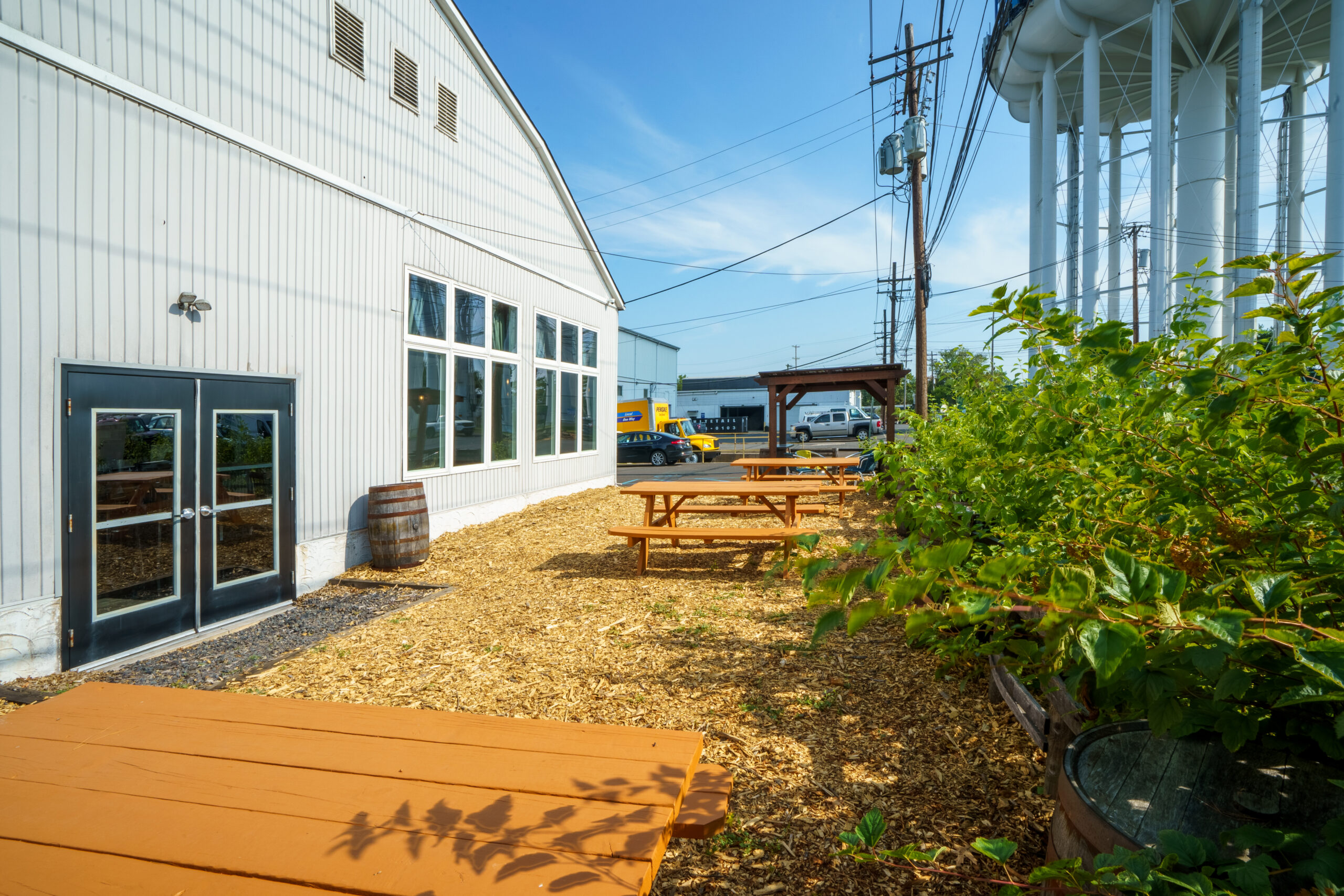 - High and low top tables with bench and cushion seating